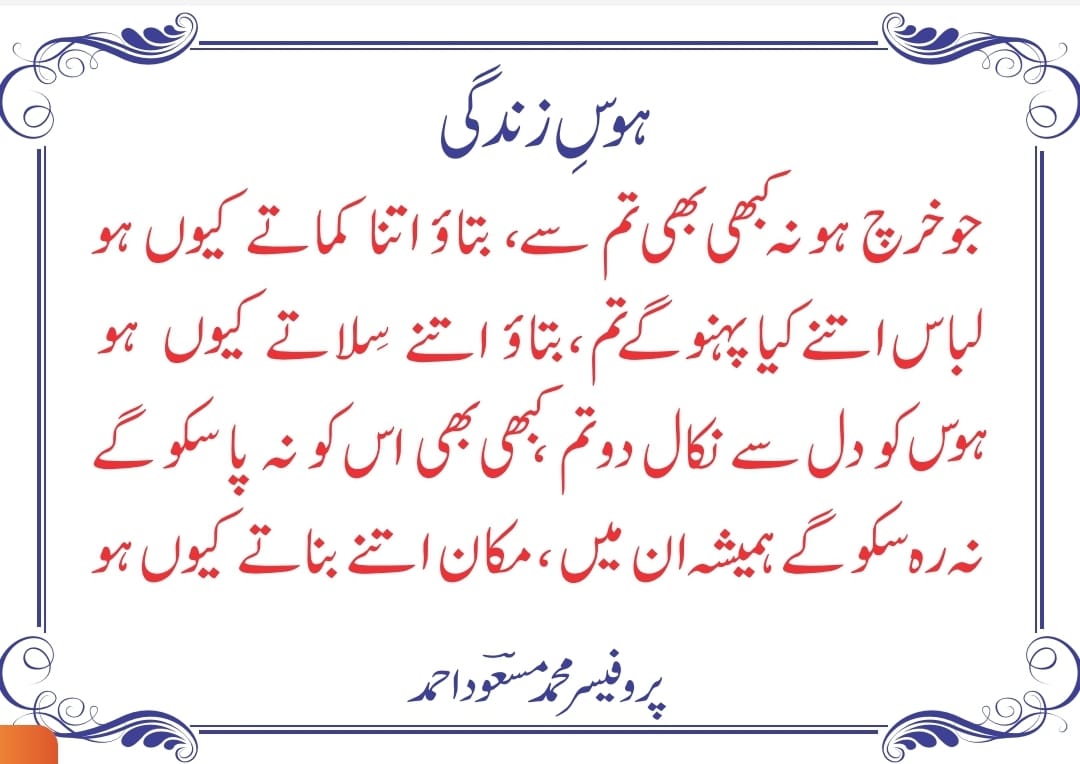آج کاشعر-"دولت کی دوڑ" از پروفیسرمسعود By Prof Masood Prof Mohammad Masood Ahmed October 23, 2025 Read more