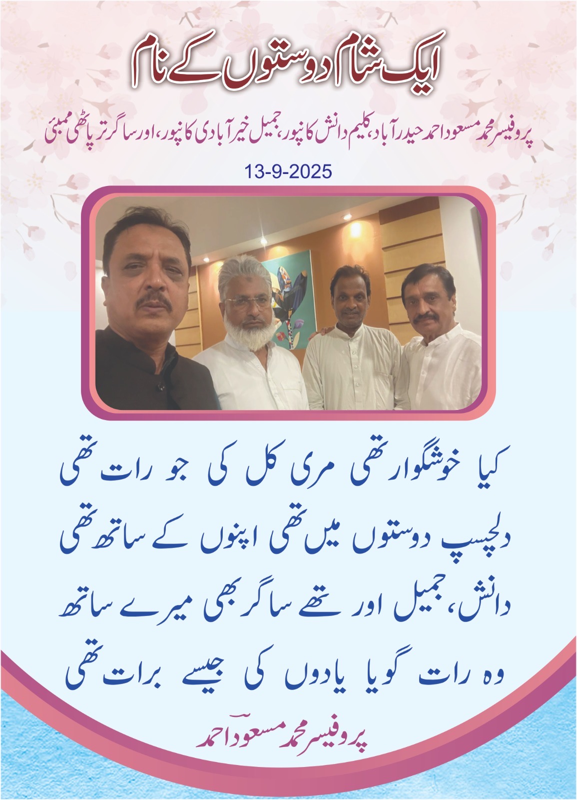 - جمیل خیرابادی، کلیم دانش اور ساگر ترپاٹی ایک شام دوستوں کےنام Get link Facebook X Pinterest Email Other Apps By Prof Masood Prof Mohammad Masood Ahmed September 15, 2025 Get link Facebook X Pinterest Email Other Apps Comments
