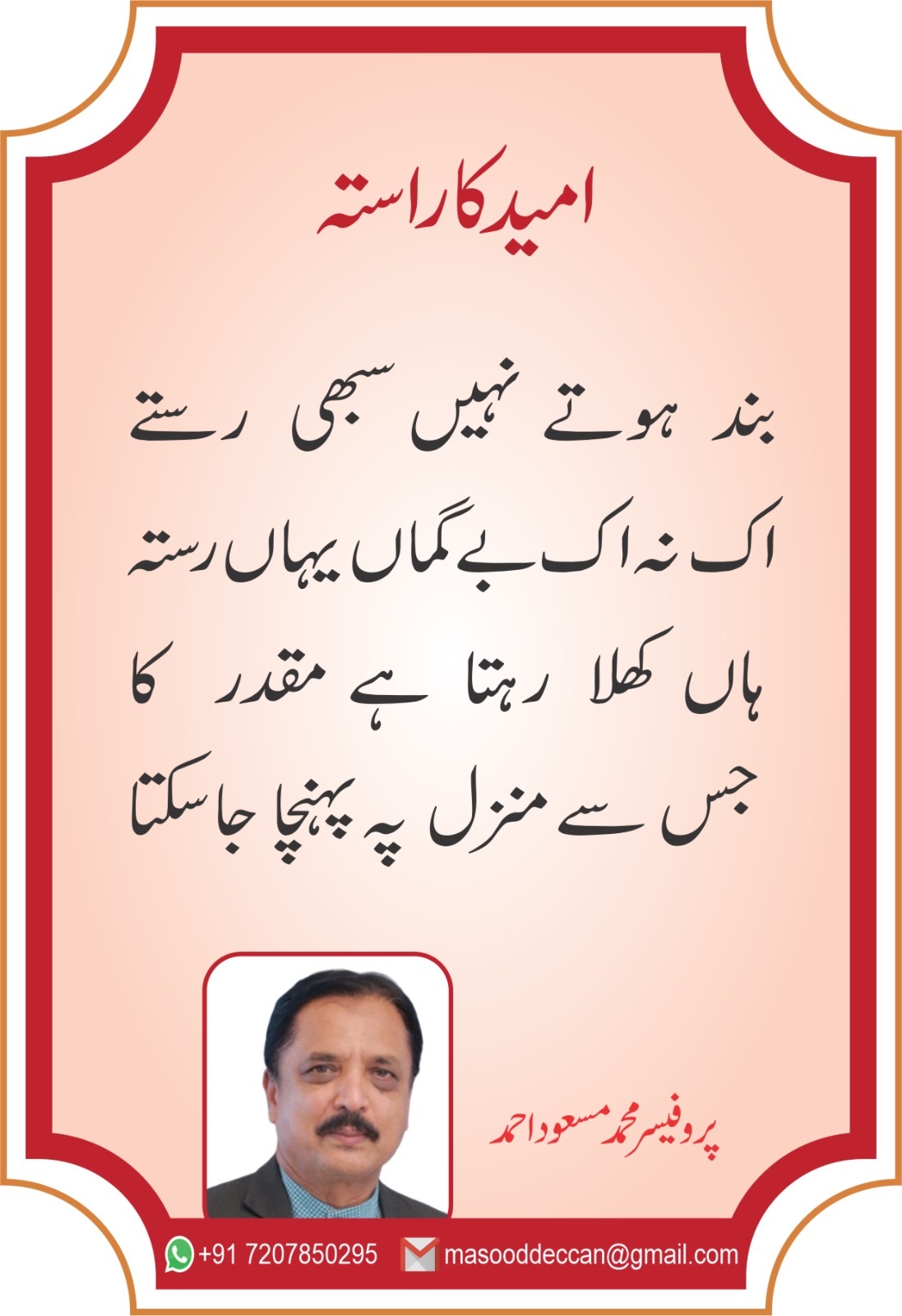 قطعہ "امیدکاراستہ" پروفیسرمحمدمسعوداحمد۔ حیدرآباد Get link Facebook X Pinterest Email Other Apps By Prof Masood Prof Mohammad Masood Ahmed November 05, 2025 Get link Facebook X Pinterest Email Other Apps Comments