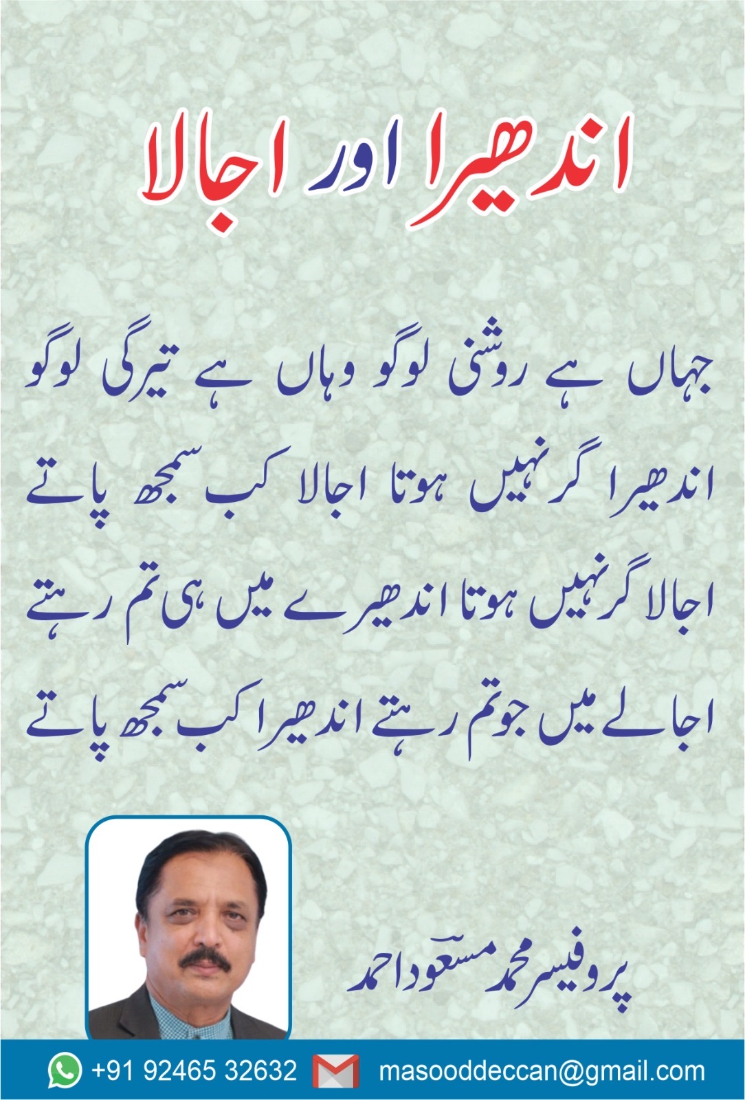 Dr Majid Deobandi, New Delhi Urdu Poetry By Prof Masood Prof Mohammad Masood Ahmed January 06, 2015 Read more