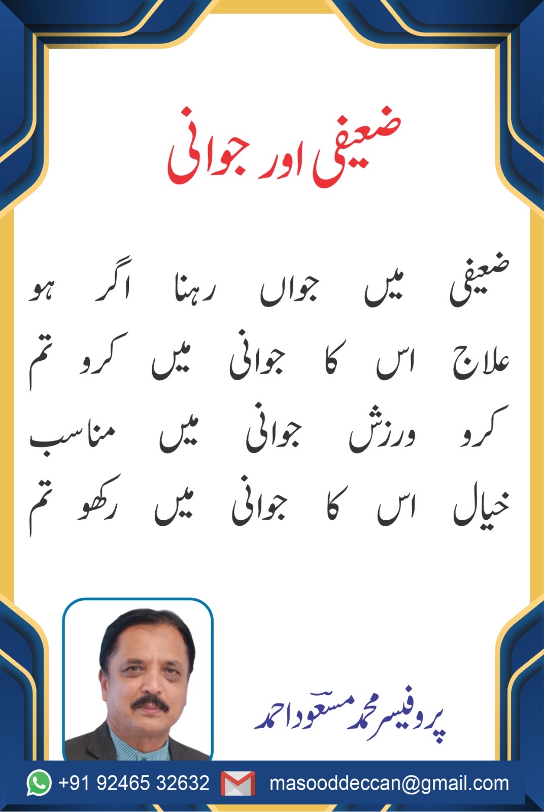 آج کا شعر-غصےپرصبر- از پروفیسرمحمدمسعوداحمد By Prof Masood Prof Mohammad Masood Ahmed October 27, 2025 Read more